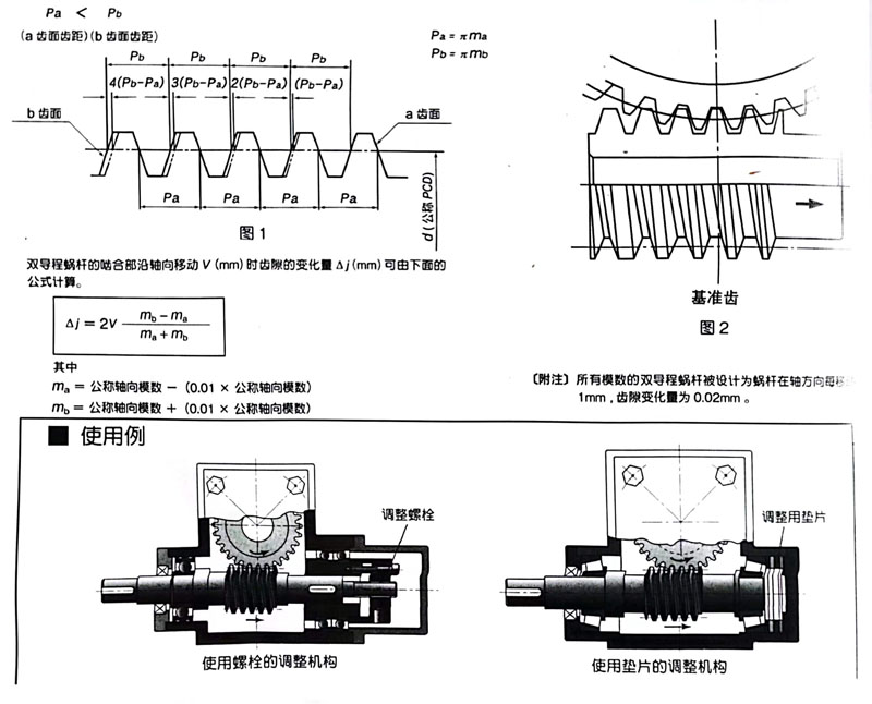 雙導程蝸桿蝸輪:通常,調整蝸桿蝸輪側隙的方法是改變其組裝距離,組裝后若想改變組裝距離,需要對齒輪箱等做大幅度的修正作業。但是,如果使用雙導程蝸桿蝸輪的話,可以不改變齒輪箱的組裝距離即可調整側隙,所以可使組裝及維修變得方便。因為雙導程蝸桿蝸輪是特殊的產品,采用時,先閱讀使用說明書。