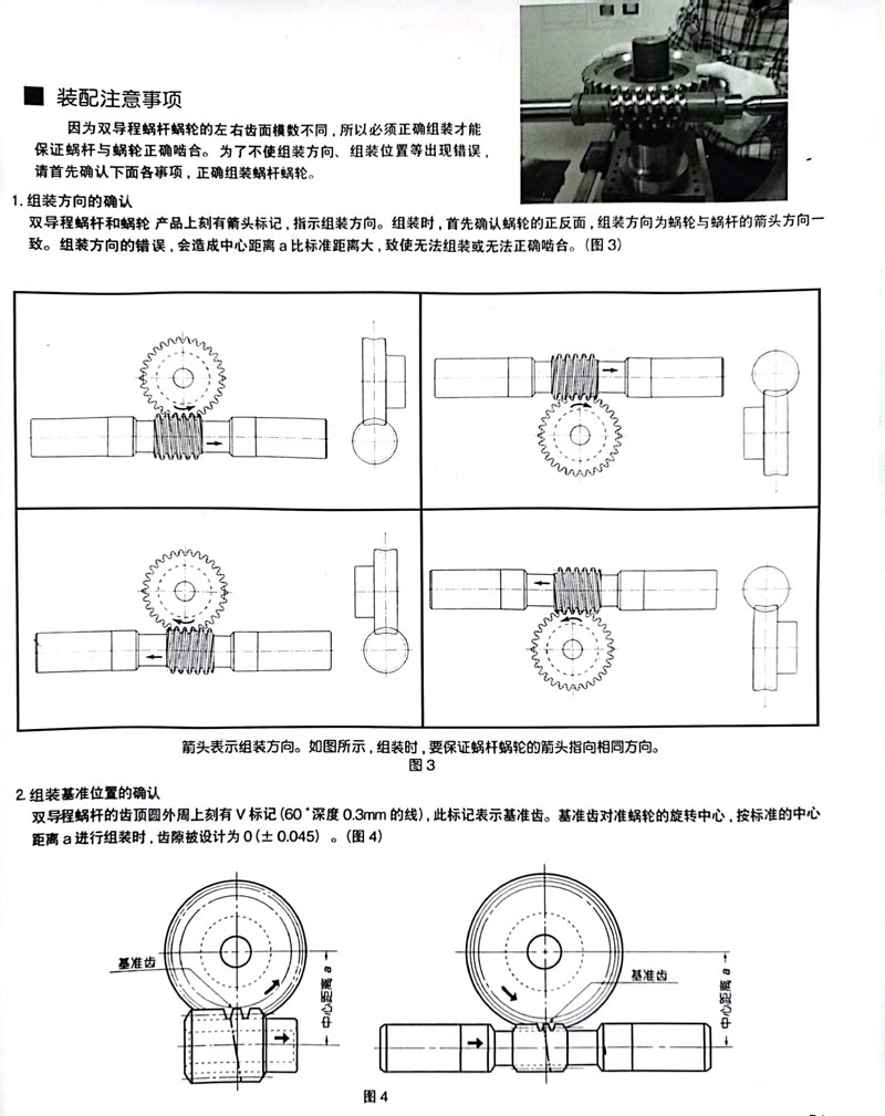 裝配注意事項:因為雙導程蝸桿蝸輪的左右齒面模數不同,所以須正確組裝才能保證蝸桿與蝸輪正確嚙合。為了不使組裝方向,組裝位置等出現錯誤,先正確組裝蝸輪蝸桿。