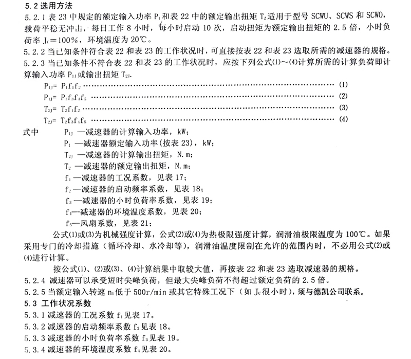 SCW減速器在選用的時(shí)候需要滿足以下條件:原動(dòng)機(jī)類型,額定輸入功率、輸入轉(zhuǎn)速、工作機(jī)類型、額定輸出扭矩、最大輸出扭矩、傳動(dòng)比、載荷性質(zhì)、裝配型式、環(huán)境溫度。